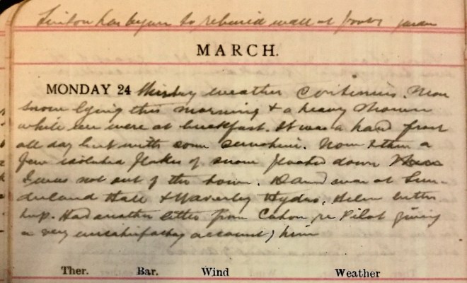 Wintery [?] weather continues. More snow lying this morning + a heavy shower while we were at breakfast. It was a hard frost all day but with some sunshine. Now + then a few isolated flakes of snow floated down. Was I was not out of town. David [Graham] over at Sunderland Hall + Waverley Hydro. Helen [Muir – see 23 March] better + up. Had another letter from Caton re [Dr] Pilot giving a very unsatisfactory account of him.