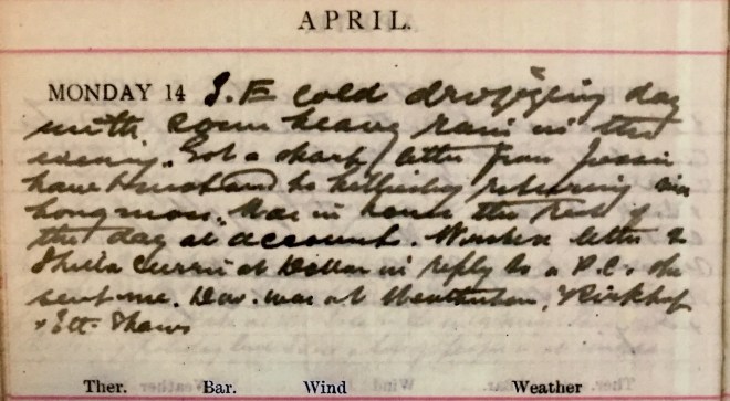 S. E cold drizzling day with some heavy rain in the evening. Got a sharp letter from Jessie [?] + motored to Lilliesleaf returning via Longmoss. Was in house the rest of the day at accounts. Wrote a letter to Sheila Currie at Dollar in reply to a P.C. [post card] she sent me. Dav [Dr David Graham] was at Weatherhouse [?], Rinkhope + Ettrick Shaws.