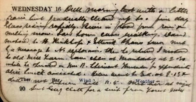 Dull morning but with a little rain but gradually cleared up to a fine day. Glass rising rapidly. River in flood from rain + melting snow. Saw town cases walking. David motored to [illegible], Rinkhope + Ettrick Shaws + was met by a message to North Deloraine. When he returned I motored to Old Mill Farm. Gave Chlor[oform] at Mauldsheugh at 2.30 while he operated on Mrs R Stewart, Thirladean, for appendicitis, Alice Smith assisted. Helen went to Edinburgh at 8.13 + did not return till 11.5. Met her at [illegible]. Sent Guy cloth for a suit from Forest Mill.