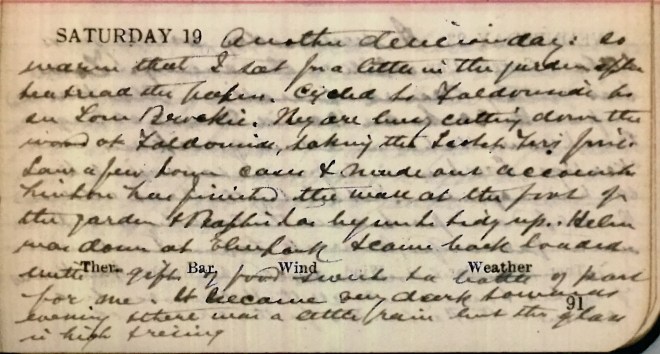 Another delicious day: so warm that I sat for a little in the garden after tea + read the papers. Cycled to Faldonside to see Tom Brockie1. They are busy cutting down the wood at Faldonside, taking the [three illegible words]? Saw a few town cases + made out accounts. Linton has finished the wall at the foot of the garden + Baptie2 has begun to tidy up. Helen3 was down at Elmpark4 + came back loaded with gifts of food sweets + a bottle of port for me. It became very dark towards evening + there was a little rain but the glass is high + rising.