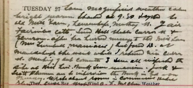 Same magnificent weather calm, bright, warm. Started at 9.30 + cycled to Old Mill farm, Lewenshope, Muthag Street, Yair, Fairnilee Cottages, Sunderland Hall stables, Curror Street + Elmrow. After tea hurried message to Old Mill Farm, (Miss Turnbull, maniacal). But found D. [Dr David Graham, co-partner] at Mauldsheugh + he went while I returned via Curror etc. Meeting of [War Memorial] sub committee [illegible] all inspected the site at British Linen Bank + were unanimous. Jack + Scott Plummer are to interview the Bank in Edinburgh on Thursday. Wrote about rooms in Commercial Hotel, Glenluce1. Wrote A L McLean [?].