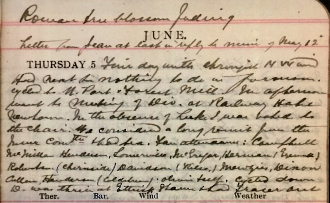Fair day with strongish N.W. wind. Had next to nothing to do in the forenoon. Cycled to N Port + Forest Mill. In afternoon went to meeting of Div. at Railway Hotel, Newtown. In the absence of Luke I was asked to the Chair. We considered a long remit from the Insur[ance] Committee + had tea. Fair attendance: Campbell, McMillan, Henderson, Somerville, McGregor, Herman (Eyemouth), Robertson (Chirnside), Davidson (Kelso), Menzies, Dixon, Cullen, Henderson (Coldstream), Oliver + self. Cycled down. D. [David Graham] was thrice at Ettrick Shaws + had Fraser out.