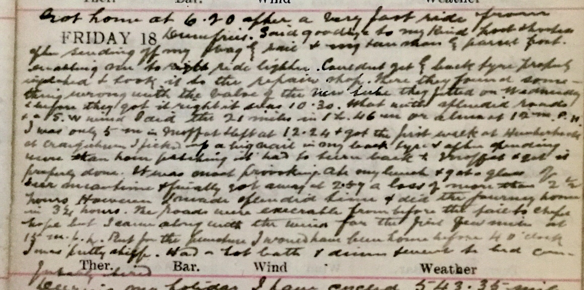 Got home at 6.20 after a very fast ride from Dumfries. Said goodbye to my kind host + hostess after sending off my bag by rail + my tan shoes by parcel post enabling me to right ride lighter. Couldn’t get by [sic] back tyre properly inflated + took it to the repair shop. There they found something wrong with the valve of the new tyre they fitted on Wednesday + before they got it right it was 10.30. What with splendid roads + a S.W. wind I did the 21 miles in 1h 46m or almost 12 m.p.h. I was only 5 minutes in Moffat I left at 12.24 + got the first walk at Hunterheck1. At Craigieburn2 I picked up a big nail in my back tyre + after spending more than [an] hour patching it had to turn back to Moffat + get it properly done. It was most provoking. Ate my lunch + got a glass of beer meantime + finally got away at 2.59, a loss of more than 2½ hours. However I did splendid time + did the journey home in 3½ hours. The roads were execrable from before the tail to Chapelhope3 but I came along with the wind for the first few miles at 15 m.p.h. But for the puncture I would have been home before 4 o’clock. I was pretty stiff. Had a hot bath + dinner + went to bed comfortably tired.