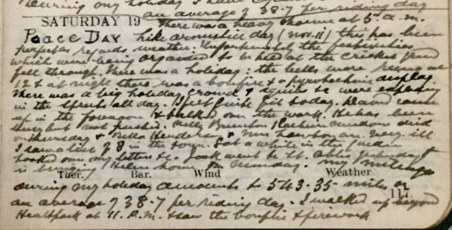 PEACE DAY1 There was a heavy storm at 5 a.m. Like armistice day (Nov 11) this has been perfect as regards weather: unfortunately the festivities which were being organised to be held at the Cricket ground fell through. There was a holiday: the bells were rung at 12 at night, there was a bonfire + a pyrotechnic display. There was a big holiday crowd + squibs &c were exploding in the streets all day. Felt quite fit today. David [Graham, co-partner] came up in the forenoon + talked over the work. He has been busy but not pushed. Nelly Brunton, Raeburn Meadows, died on Thursday + Bella Henderson + Mrs Lawton are very ill3. I saw a list of 8 in the town. Sat a while in the garden, looked at my letters &c. Jack [Roberts] went to St Abbs yesterday, is bringing Helen [Muir] home on Monday. My mileage during my holiday amounts to 543.35 miles or an average of 38.7 per riding day. I walked up beyond Heathpark at 11 p.m. + saw the bonfire + firework.