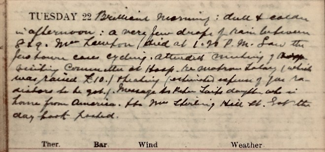 Brilliant morning: dull + colder in afternoon: a very few drops of rain between 8 + 9. Mrs Lawton died at 1.20 p.m1. Saw the few town cases cycling. Attended meeting of Hosp visiting Committee at Hosp. re matron’s salary (which was raised £10) + heating (estimated expense of radiators to be got). Message to Helen [?] Tait’s daughter, who is home from America, + to Mrs Stirling, Hill Street. Got the day book posted.