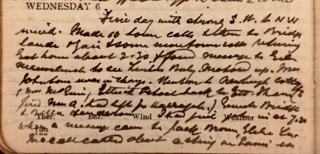 Fine day with strong S.W. to N.W. wind. Made 10 town calls + then to Bridgelands + Yair + some more town calls returning. Got home about 2.30 to find message to Gilmanscleuch to see Linton’s baby. Motored up. Mrs Johnstone was in charge. Went on to Newburgh Cottages (Miss Mc?), Ettrick School, back to Ettrick Shaws (to find Miss A had left for Harrogate), General’s Bridge + Bella Henderson. I had finally got in at 7.30 when a message came to Jack Brown, Glebe Terrace. McCall called about a sting in [illegible]’s ear.