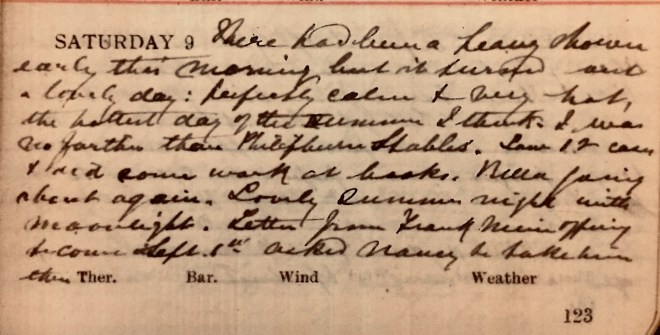 There had been a heavy shower early this morning but it turned out a lovely day: perfectly calm + very hot, the hottest day of the summer I think. I was no farther than Philipburn Stables. Saw 12 cases + did some work at books [accounts]. Bella [Paulin, housekeeper] going about again. Lovely summer night with moonlight. Letter from Frank Muir offering to come September 1st. Asked Nancy [Roberts née Muir] to take him then.