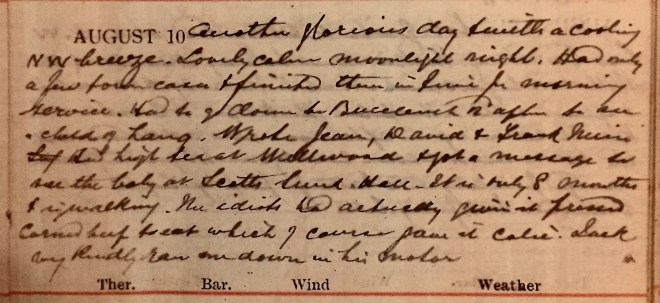 Another glorious day + with a cooling N.W. breeze. Lovely calm moonlight night. Had only a few town cases + finished them in time for morning service. Had to go down to Buccleuch Road after to see a child of Lang. Wrote Jean [Muir], David + Frank Muir. Had high tea at Wellwood + got a message to see the baby at Scott’s, Sunderland Hall. It is only 8 months + is walking. The idiots had actually given it corned beef to eat which of course gave it colic. Jack [Roberts] kindly ran me down in his motor.