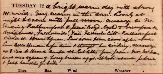 A bright warm day with strong W wind. Very warm in the sun. Lovely at night + calm with full moon. Message to M Glendinning, Peelburnfoot1 + Jessie Boyd.2Cycled to Greenfoot &c, Bridgelands, Faldonside, Yair, Fairnilee Cottage, Peelburnfoot, Bridge Street + Green [Square ?]. Saw some town cases after tea. Saw Bella Henderson before dinner + thought her sinking.3 Message at 8.50 to Heard, Castle Street4. Got letter from Jean.5 Mrs McIntosh sent me a square of honey + some eggs.6 Wrote about petrol + felt handles for bike.