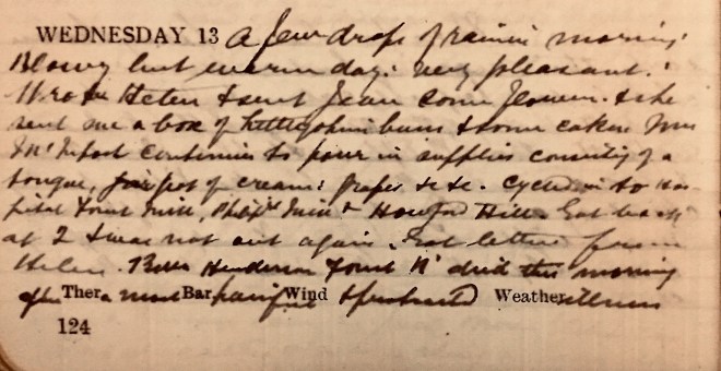 A few drops of rain in morning. Blowy but warm day. Very pleasant. Wrote Helen [Muir] + sent Jean [Muir] some flowers + she sent me a box of ? buns + some cake. Mrs McIntosh continues to pour in supplies consisting of a tongue, pot of creams grapes &c &c. Cycled in to Hospital, Forest Mill, Philipburn Mill + Howford Hill. Got back at 2 + was not out again. Got letter from Helen. Bella Henderson, Forest Road, died this morning after a most painful + protracted illness1.