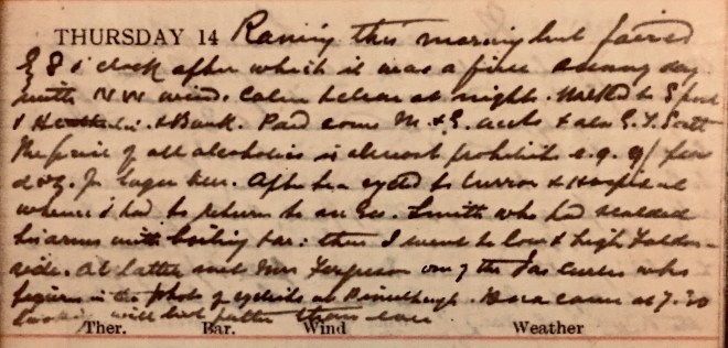 Raining this morning but faired by 8 o’clock after which it was a fine sunny day with N.W. wind. Calm + clear at night. Walked to S. Port + Heatherlie + Bank. Paid some M&G [Muir and Graham medical co-partnership] accounts + also G T Scott. The price of all alcoholics is almost prohibitive e.g. 9/- per dozen for lager beer. After tea cycled to Curror Street + Hospital whence I had to return to see George Smith who had scalded his arms with boiling tar: then I went to Low + High Faldonside. At latter met Mrs Ferguson one of the James sisters [?] who figure in the photo of cyclists at Penielheugh. Dora [Muir] came at 7.30 looking [?] rather than [?].