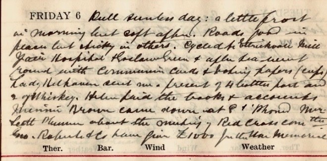 Dull sunless day: a little frost in morning but soft after. Roads good in places but sticky in others. Cycled to Ettrickvale Mill, , Yair, Hospital, Goslaw Green + after tea went round with communion cards + voting papers (cups) [?]. Lady Belhaven1 sent me a present of 4 bottles port + 2 of Whiskey [sic]. Helen paid the books + accounts. Minnie Brown2 came down at 8 + ‘phoned Mrs Scott Plummer3 about the meeting of Red Cross Commttee. Geo Roberts + Co4 have given £1000 for the War Memorial.