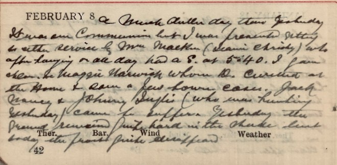 A much duller day than yesterday. It was our Communion but I was prevented from getting to either service by Mrs Malkin (Jeannie Christy) who, after hanging on all day, had a S. [son] at 5.401. I gave chlor[oform] to Maggie Warwick whom D. [Dr David Graham, co-partner] curetted at the Home + saw a few town cases. Jack, Nancy + Johnny Ingles2 (who was hunting yesterday) came for supper. Yesterday the ground remained hard in the shade but today the frost quite disappeared.