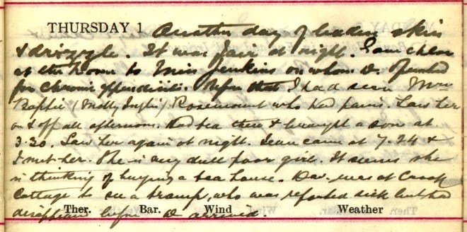 Another day of leaden skies + drizzle. It was fair at night. Gave chlor[oform] at the House to Miss Jenkins on whom D. [Dr David Graham] operated for chronic appendicitis. Before that I had seem Mrs Baptie (Molly Inglis)1, Rosemount2 who had pains. Saw her on + off all afternoon. Had tea there + brought a son at 3.30. Saw her again at night. Jean came at 7.24 + I met her. She is very dull poor girl. It seems she is thinking of buying a tea house. Dav. [Graham] was at Crook Cottage to see at tramp, who was reported sick but had disappeared before D. arrived.