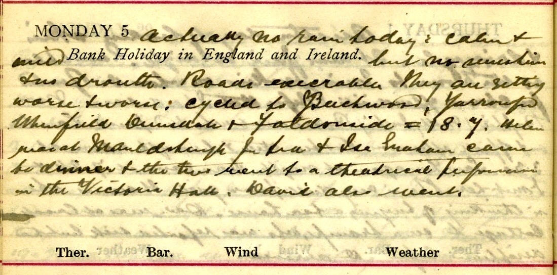 Actually no rain today : calm + mild but no sunshine + no drouth1. Roads execrable, they are getting worse + worse: cycled to Beechwood, Yarrowford, Whinfield, Dunsdale + Faldonside = 18.7 [miles]. Helen2 was at Mauldsheugh for tea + Isa Graham3 came to dinner + the two of them went to a theatrical performance in the Victoria Hall. David [Graham] also went.
