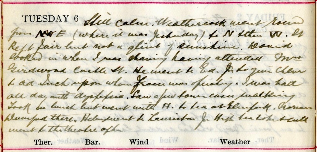 Still calm. Weathercock went round from N.E. (where it was yesterday) to N. then W. It kept fair but not a glint of sunshine. David1 looked in when I was shaving having attended Mrs Girdwood, Castle Street.2 He went to Edinburgh for to give Chlor[oform] to Adam Inch3 upon whom Fraser was operating. I was bad all day with dyspepsia. Saw a few town cases walking. Took no lunch but went with H4 to tea at Elmpark.5 Norman Durnford6 there. Helen went to Lauriston for high tea + she + Cath7 went to the theatre after.