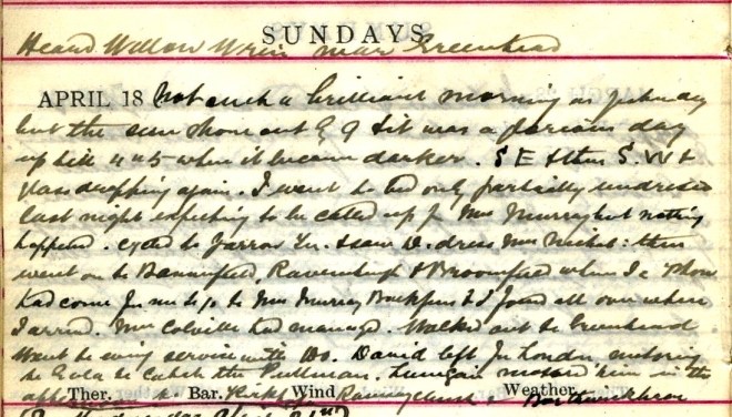 Not such a brilliant morning as yesterday but the sun shone out by 9 + it was a glorious day up till 4 or 5 when it became darker. S.E. + then S.W. [wind] + glass dropping again. I went to bed only partially undressed last night expecting to be called up for Mrs Murray but nothing happened. Cycled to Yarrow Terrace + saw D. [Dr Graham] dress Mrs Nichol: then went on to Bannerfield, Ravensheugh + Broomfield where I a ‘Phone [sic] had come for me to see Mrs Murray, Backfeus2 + I found all over when I arrived3 . Mrs Colville4 had managed. Walked out to Greenhead. Went to evening service with Do. [Dora Muir]. David [Graham] left for London, motoring to Gala to catch the Pullman. Lumgair motored him in the afternoon to Rinkhope, Ramseycleuch + Borthwickbrae.