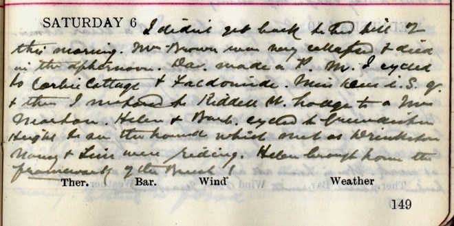 I didn’t get back to bed till 2 this morning. Mrs Brown1 was very collapsed + died in the afternoon. Dav. [Graham, co-partner] made a P.M. [Post Mortem]. I cycled to Corbie Cottage + Faldonside. Miss Dees2 i.s.q.3 + then I motored to Riddell W. Lodge to a Mrs Morton4. Helen + Barb.5 Cycled to Grundiston Height to see the hounds which met at Drinkston6. Nancy + Tim7 were riding. Helen brought home the framework of the brush!