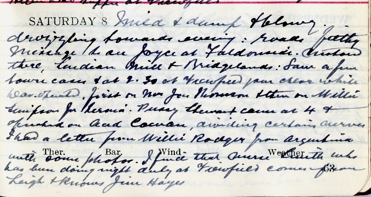 Mild + damp + blowy, drizzling towards evening: roads filthy. Message to see Joyce1 at Faldonside. Motored there, Lindean Mill + Bridgelands: Saw a few town cases + at 2.30 at Viewfield gave Chlor[oform] while Dav. operated, first on Mrs Jean Thomson + then on Willie Simpson2 for hernia. Pussy Stewart3 came at 4 + operated on And. Cowan4, dividing certain nerves. I had a letter from Willie Rodger5 from Argentina with some photos. I find that nurse Smith who has been doing night duty at Viewfield comes from Leigh6 + knows Jim Hayes7.