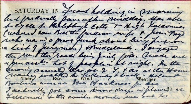 Frost holding in morning but gradually gave after midday. Was able to cycle to Philiphaugh Cottages + High Faldonside (where I saw Bell the gardener’s wife + Jessie Boyd1 who is in a great funk about being put on a list of jurymen) + Bridgelands. I enjoyed the run the roads being fairly good. Made out a few accounts. Dav. at 2 T. + A.s at the Home2. Nancy walked to Lilliesleaf + back. Helen + Barbara3 were at Mrs Harkness’ for tea4. I actually got some snowdrops in flower at Faldonside + the winter aconite was out too.