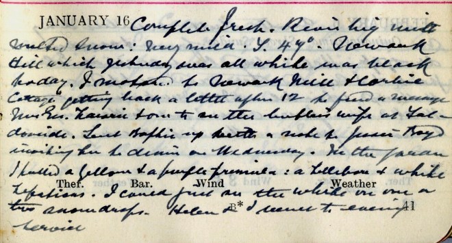 Complete [?] fresh. Rivers big with melted snow: very mild. T.47o. Newark Hill, which yesterday was all white was black today. I motored to Newark Mill + Corbie Cottage getting back a little after 12 to find a message [to] Mrs Geo. Lawrie1 + one to see the butler’s wife at Faldonside. Sent Baptie2 up with a note to Jessie Boyd3 inviting her to dinner on Wednesday. In the garden I pulled a yellow + a purple Primula: a hellebore + white hepaticas. I could just see the white on one or two snowdrops. Helen + I went to evening service.