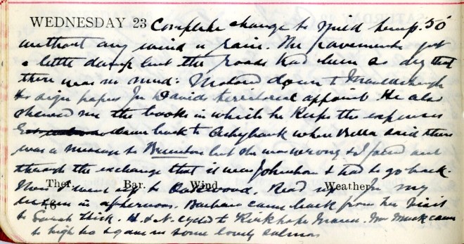 Complete change to mild, temp. 500 without any wind or rain. The pavements got a little damp but the roads had been so dry that there was no mud. Motored down to Mauldsheugh1 to sign papers for David’s Territorial Appoint[ment]. He also showed me the books in which he keeps the expenses. words deleted Came back to Ashybank where Bella2 said there was a message to Brunton but she was wrong + I found out through the exchange that it was Johnstone + had to go back. Then I went up to Oakwood. Read up for my lecture in afternoon. Barbara3 came back from her visit to Sarah Stick4. H. + N.5 cycled to Kirkhope Manse. Mrs Mack6 came to high tea + gave us some lovely salmon.