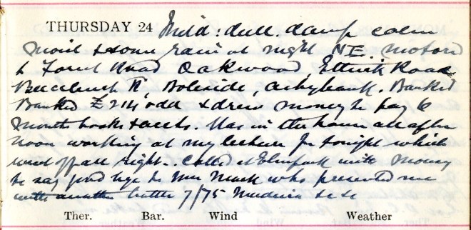 Mild: dull, damp, calm + some rain at night. [Wind] N.E. Motored to Forest Road, Oakwood, Forest Road, Boleside [and] Ashybank. Banked Banked [sic] £214 odd + drew money to pay 6 months books + accounts. Was in the house all afternoon working at my lecture for tonight which went off all right. Called at Elmpark1 with Mousey2 to say good bye to Mrs Mack3 who presented me with another bottle of /75 Madeira4 +c +c.