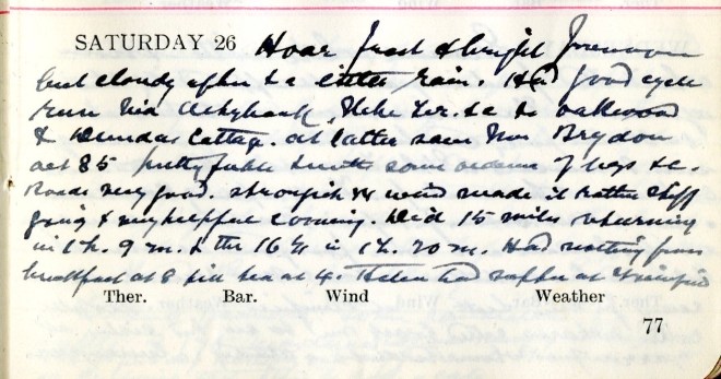 Hoar frost + bright forenoon but cloudy after + a little rain. Had a good cycle run via Ashybank, Glebe Terrace, +c to Wellwood + Dundas Cottage1. At latter saw Mrs Brydon2aet 85, pretty feeble + with some oedema of the legs +c. Roads very good. Strongish W. wind made it rather stiff going + very helpful coming. Did 15 miles returning in 1 h. 9 m. + the 1614 in 1 h. 20 m. Had nothing from breakfast at 8 till tea at 4. Helen3 had supper at Viewfield.