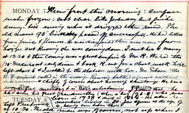 Keen frost this morning: surface water frozen: not clear like yesterday but quite sunny till evening when it drizzled + then rained. The old man’s 95th birthday passed off successfully1. He had letters from friends + flowers [?]. He was disappointed there was none from Lizzie2 not knowing she was coming down. I met her + Nancy3 at 12.20 + their coming was a great surprise to Mr R. We had the /75 Madeira4 + early dinner + took R. out for a short walk. Lizzie left about 6 + I walked to the station with her. Mr Gibson the U.F. minister5 called in the evening. Rennie talked almost without remission + chiefly of course about himself + his doings. He has a wonderful memory + is very entertaining. I found that he had seen his great grandmother (when a boy of 6-8) who was born in 1738 + died in 1836. He also remembers living in St. James Square at the age of 4, having been born there.