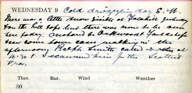Cold, drizzling day S.W. [wind]. There was a little snow visible at Falahill yesterday + on the hill tops, but there was none to be seen here today. Motored to Oakwood + Fauldshope + saw some town cases walking in the afternoon. Ralph Smith1 called in the at 4.30 + I examined him for the Scottish Prov.2