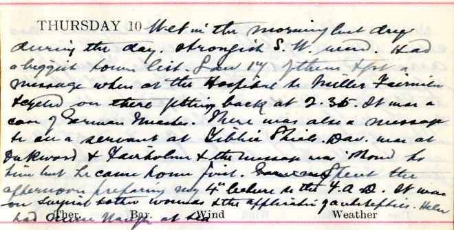 Wet in the morning but dry during the day. Strongish S.W. wind. Had a biggish town list. Saw 17 of them + got a message when at the hospital to Miller1, Fairnilea + cycled there getting back at 2.35. It was a case of German Measles. There was also a message to see a servant at Tibble Shiels2. Dav.3 was at Oakwood + Fairholme4 + the message was ‘Phoned to him but he came home first. Gave mes Spent the afternoon preparing my 4th lecture to the V.A.D. It was surgical + other wounds + the application of antiseptics. Helen5 had Nurse Waugh6 at tea.
