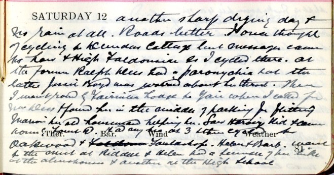 Another sharp drying day + no rain at all. Roads better. I once thought of cycling to Dundas Cottage1 but messages came to Low + High Faldonside so I cycled there. At the former Ralph Dees2 had a Paronychia + at the latter Jessie Boyd3 was worried about her throat. Then I went round by Fairnilee Lodge to Yair where I called for Mrs Dees [Dubs4] + found her in the middle of packing for flitting. Marion her old housemaid helping her. Saw Harvey’s [?] kid + came home by Forest Road. Had my tea at 3 + then cycled to Oakwood + Faldon Fauldshope. Helen5 + Barb.6 went to the meet at Riddell + Helen had a tumble of [sic] her bike at the almshouses + another at the High School.