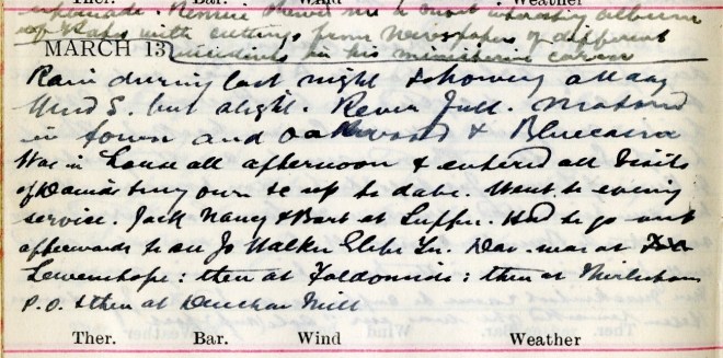 Rain during last night [and] showery all day. Wind S. but slight. River full. Motored in town and Oakwood + Bluecairn. Was in town all afternoon + entered at visits of David1 + my own &c up to date. Went to evening service. Jack, Nancy + Barb2 at supper. Had to go out afterwards to see John Walker3, Glebe Terrace. Dav. [David] was at Fal Lewenshope: then at Faldonside: then at Thirladean P.O. + then at Deuchar Mill.
