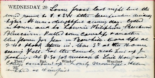 Some frost last night but the wind round to S. + S.W. + the temperature decidedly higher. It was a delightful sunny day. Cycled in town and to Lowrie1, Philipburn, Beechwood, Bluecairn. Pulled some Cowslips + another blue flower for Jean2 in Bowhill. Dora3 left at 2.40 + took them in. Was 3 [times] at the Home4 seeing Fell5. Got the County accounts put up for posting. At 8.30 got message to Tait6, Howford Cottage + motored up. Lovely moonlight. Helen7 supped at Viewfield.