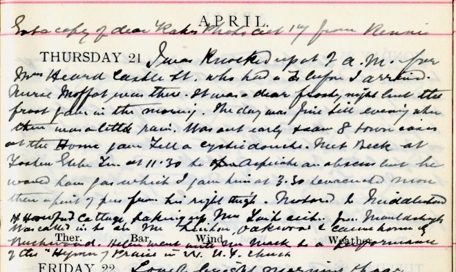 I was knocked up at 2 a.m. for Mrs Heard, Castle Street who had a d.3 before I arrived. Nurse Moffat4 was there. It was a clear frosty night but the frost gone in the morning. The day was fine till evening when there was a little rain. Was out early + saw 8 town cases at the Home. Gave Fell5 a cystic douche. Met Beck6 at Foster7, Glebe Terrace at 11.30 to [illegible] an abscess but he would have gas which I gave him at 3.30 + evacuated more than a pint of pus from his right thigh. Motored to Middlestead + Howford Cottage, taking up Mrs Tait’s8 account from Mauldsheugh. Was called in to see Mrs Linton9, Oakwood + came home by Beechwood. Helen10 went with Mrs Mack11 to a performance of the “Hymn of Praise”12 in W. U.F. Church13.