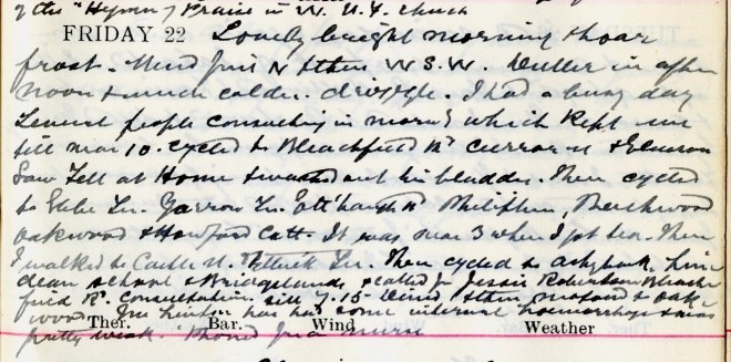 Lovely bright morning + hoar frost. Wind just N. + then W.S.W. Duller in afternoon + much colder. Drizzle. I had a busy day, several people consulting in morn which kept me till near 10. Cycled to Bleachfield Road, Curror Street + Elmrow. Saw Fell1 at Home + washed out his bladder. Then cycled to Glebe Terrace, Yarrow Terrace, Ettrickhaugh Road, Beechwood, Oakwood + Howford Cottage. It was near 3 when I got tea. Then I walked to Castle Street, Ettrick Terrace. Then cycled to Ashybank, Lindean School + Bridgelands + called for Jessie Robertson2, Bleachfield Road. Consultation till 7.15. Dined + then motored to Oakwood. Mr Linton3 has had some internal haemorrhage + was pretty weak. ‘Phoned for a nurse.