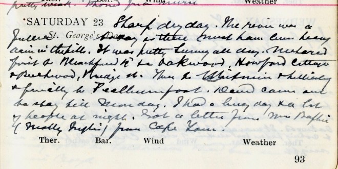 Sharp dry day. The river was a fuller [sic] today as there must have been heavy rain in the hills. It was pretty sunny all day. Motored first to Bleachfield Road +c, Oakwood, Howford Cottage + Beechwood, Bridge Street. Then to Whitmuir + Lilliesleaf + finally to Peelburnfoot. David1 came over to stay till Monday. I had a busy day + a lot of people at night. Got a letter from Mrs Baptie (Molly Inglis2) from Cape Town.