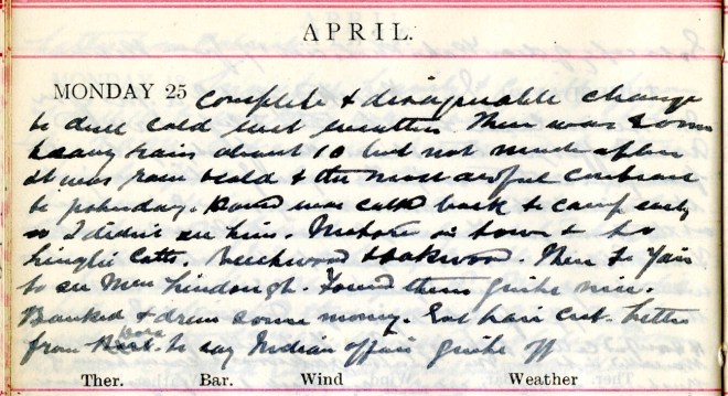Complete + disagreeable change to dull cold wet weather. There was some heavy rain about 10 but not much after. It was raw + cold + the most awful contrast to yesterday. David1 was called back to camp early so I didn’t see him. Motored in town + to Linglie Cottages, Beechwood + Oakwood. Then to Yair to see Mrs Lindough2. Found them quite nice. Banked + drew some money. Got hair cut. Letter from Dora3 to say Indian affair quite off.