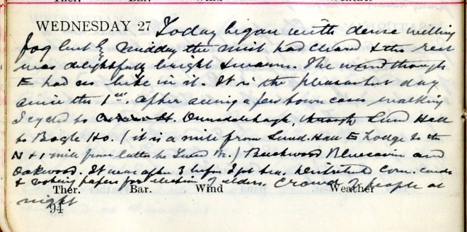 Today began with dense welling fog but by midday the mist had cleared + the rest was delightfully bright + warm. The wind though E had no bite in it. It is the pleasantest day since the 1st. After seeing a few town cases walking I cycled to Curror St Dunsdalehaugh through Sunderland Hall to Bogle House (it is a mile from Sund. Hall E. Lodge to N. + 1 mile from latter to Tweed Bridge), Beechwood, Bluecairn and Oakwood. It was after 3 before I got tea. Distributed Communion Cards + voting papers for election of elders. Crowd of people at night.