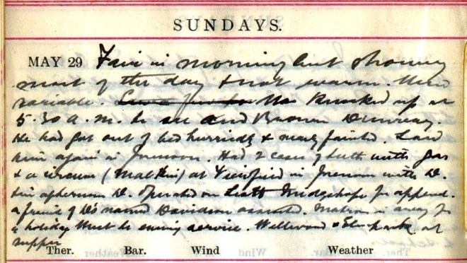Fair in morning but showery most of the day + not warm. Wind variable xxxxxx Was knocked up at 5.30 a.m. to see And. Brown1, Dunreay. He had got out of bed himself + nearly fainted. Saw him again in forenoon. Had 2 cases of teeth with gas + a woman (Malkin2) at Viewfield in forenoon with D.3 + in afternoon D. operated on Scott4, Midgehope for append[icitis], a friend of D’s named Davidson5 assisted. Matron is away for a holiday. Went to evening service. Wellwood + Elmpark6 at supper.