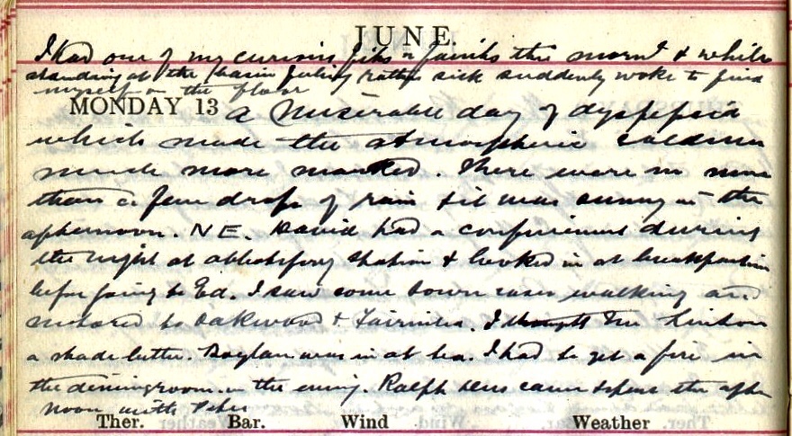 A miserable day of dyspepsia which made the atmospheric coldness much more marked. There were no more than a few drops of rain + it was sunny in the afternoon. N.E. David1 had a confinement2 during the night at Abbotsferry Station3 + looked in at breakfast before going to Ed. [Edinburgh]. I saw some town cases walking + motored to Oakwood + Fairnilea. I thought Mr Linton4 a shade better. Boylan5 was in at tea. I had to get a fire in the dining room in the evening. Ralph Dees6 came + spent the afternoon with Peter7.