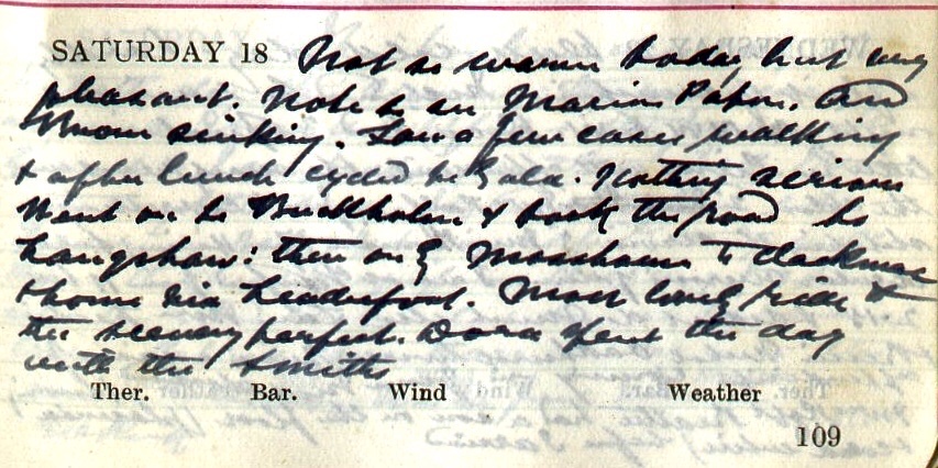 Not so warm today but very pleasant. Note to see Marion Paton1. Andrew Brown2 sinking. Saw a few cases walking + after lunch cycled to Gala. Nothing serious3. Went on to Buckholm + took the road to Langshaw: then on by Mosshouses to Clackmae4 + home via Leaderfoot. Most lovely ride + the scenery perfect. Dora5 spent the day with the Smiths6.