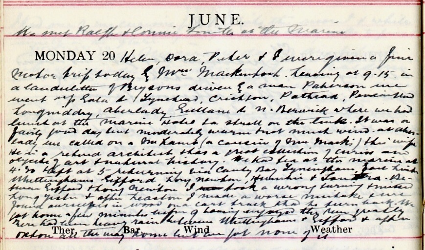 Helen, Dora1, Peter2 + I were given a fine motor trip today by Mrs Mackintosh3. Leaving at 9.15 in a landaulette of Bryson’s4 driven by a man Paterson we went up Gala5 to Tynehead, Crichton, Pathhead, Pencaitland, Longniddry, Aberlady, Gullane to N. Berwick where we had lunch at the Marine Hotel6 + a stroll on the Links. It was a fairly good day but moderately warm + not much wind. At Aberlady we called on a Mr Lamb7 (a cousin of Mrs Mack’s) + his wife. He is a retired architect + has a great collection of curios and objects of art + natural history. We had tea at the marina at 4.30 + left at 5 returning via Canty Bay8, Tyninghame, East Linton, Whittinghame, Gifford, Long Newton, Humbie + Soutra. Between Gifford and Long Newton I took a wrong turning + after Leaston9 I made a worse mistake + found ourselves in wood on a cart track + had to turn back. We got home a few minutes before 9 having enjoyed the run greatly. There had been heavy rain between Whittinghame + Gifford + after Oxton all the way home but we got none of it.