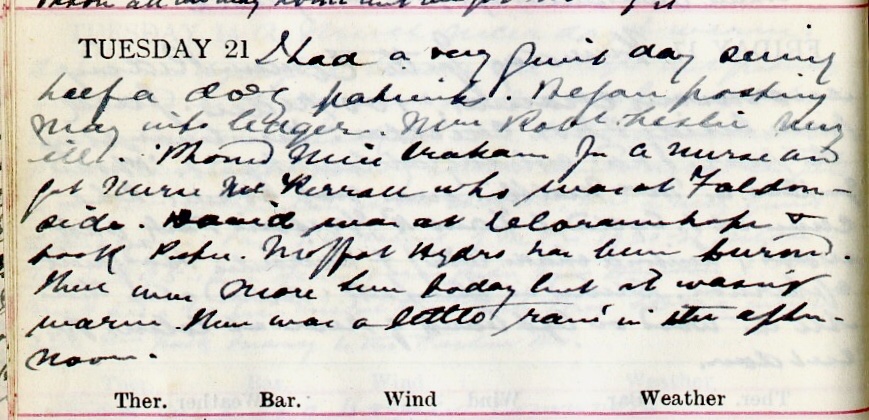 Had a very quiet day seeing half a dozen patients, before posting May [accounts] into ledger. Mrs Robert Leslie1 very ill. ‘Phoned Miss Graham2 for a nurse + got Nurse McKerrall3 who was at Faldonside. David4 was at Delorainehope5 + took Peter6. Moffat Hydro has been burned7. There was more sun today but it wasn’t warm. There was a little rain in the afternoon.
