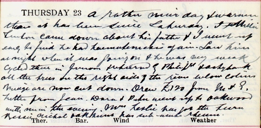 A rather nice day + warmer than it has been since Saturday. I Willie [?] Linton1 came down about his father2 + I went up early to find he has haematemesis3 again. Saw him at night when it was going on + he was very weak. Cycled there in forenoon + returned by Philiphaugh + Ashybank all the trees on the right side of the river below Colin’s Bridge are now cut down. Drew £120 from M. & G.4 Letter from Jean5. Dora6 + Peter7 went up to Oakwood with me in the evening. Mrs Leslie8 has got the [illegible]. Bessie Nichol9, Oakhurst has sub-acute rheum.
