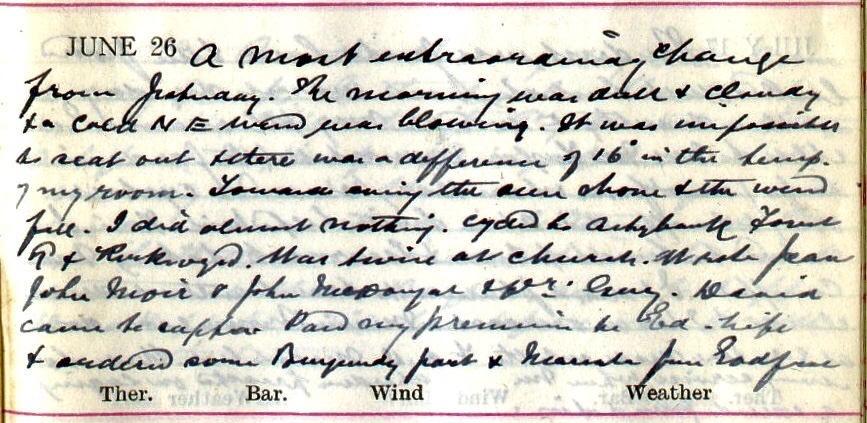 A most extraordinary change from yesterday. The morning was dull + cloudy + a cold N.E. wind was blowing. It was impossible to seat out + there was a difference of 160 in the temp. of my room. Towards evening the sun shone + the wind fell. I did almost nothing. Cycled to Ashybank, Forest Road + Kirkwynd. Was twice at church. Wrote Jean1, John Moir2 + John McDougal3 + Dr Gray4 [?]. Paid my premium to Ed. Life + ordered some Burgundy port + Marsala from Godfree5.