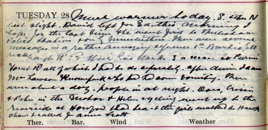 Much warmer today. S. + then N. just slight. David1 left for Ed. [Edinburgh] this morning, I hope for the last time2 + he went first to Thirlestane Police Station3 + on by Innerleithen. There were several messages in a rather annoying sequence 1st Bartie4, Ettrickhaugh Road: 2nd Weir, Gas Works 3[rd] a man at Purves’, Forest Road5 all of which I had to do separately. After dinner I saw Mr Lawson6, Knowepark who had had some vomiting. There were about a doz. people in at night. Dora7, Chrissie8 + Peter9 in the motor + Helen10 cycling went up to the riverside at Howford11 + had tea + the girls walked to Hawkshaw12 + called for Anna Scott13.