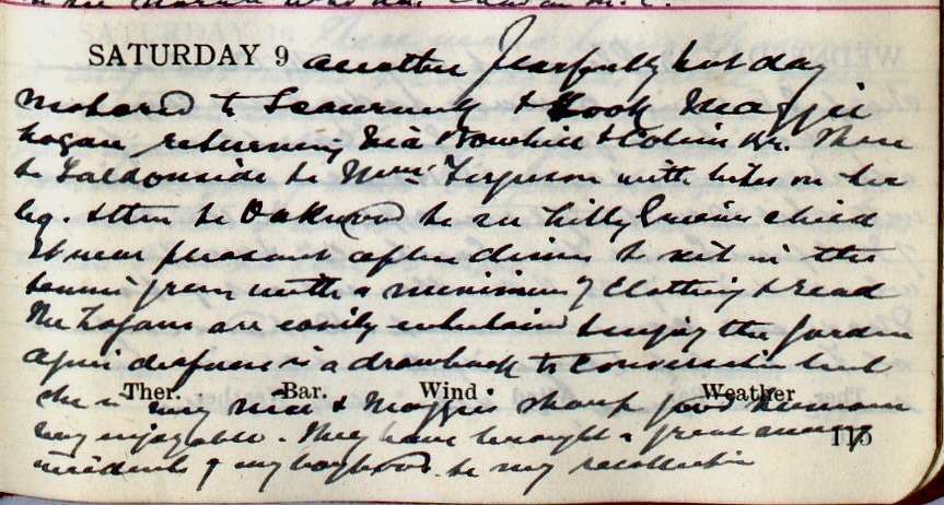 Another fearfully hot day. Motored to Scaurneuk + took Maggie Logan1 returning via Bowhill + Colin’s Bridge. then to Faldonside to Mrs Ferguson2 with bites on her leg. Then to Oakwood to see Lilly Grieve’s child3. It was very pleasant after dinner to sit in the tennis green with a minimum of clothing + read. The Logans are easily entertained + enjoy the garden. Agnes’4 deafness is a drawback to conversation but she is very nice + Maggie’s sharp good humour very enjoyable. They have brought a great many incidents of my boyhood to my recollection.