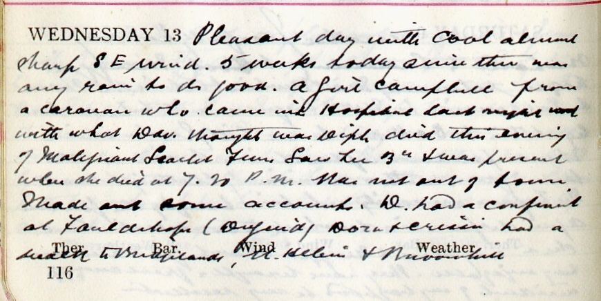 Pleasant day with cool almost sharp SE wind. 5 weeks today since there was any rain to do good. A girl Campbell1 from a caravan who came into Hospital2 last night with what Dav.3 thought was Diph[theria] died this evening of Malignant Scarlet Fever. Saw her three times + was present when she died at 7.20. Was not out of town. Made out some accounts. Dav. had a confinement at Fauldshope (Duguid4). Dora5 + Crissie6 had a walk to Bridgelands, St Helen’s + Broomhill7.