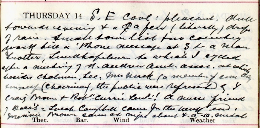 S.E. Cool: pleasant, dull towards evening + a few (literally) drops of rain. Small town list + no country work till a ‘Phone message at 3 to a man Trotter1, Sundhopeburn to which I cycled after a meeting of St Andrew Amb. Assoc.2 at which, besides Chalmers3, Sec[retary], Mrs Mack4 (a member of the Comttee), myself (Chairman), the public was represented by T Craig Brown5 + Robert Currie Senr!6 A nurse friend of Dora’s = Sarah Campbell7 came for the week end. Minnie Brown came at night about V.A.D. medals8.
